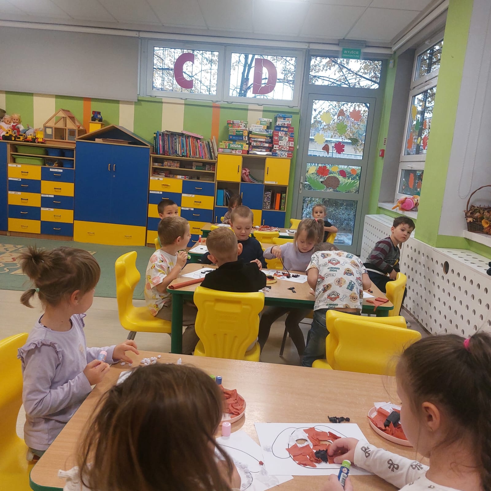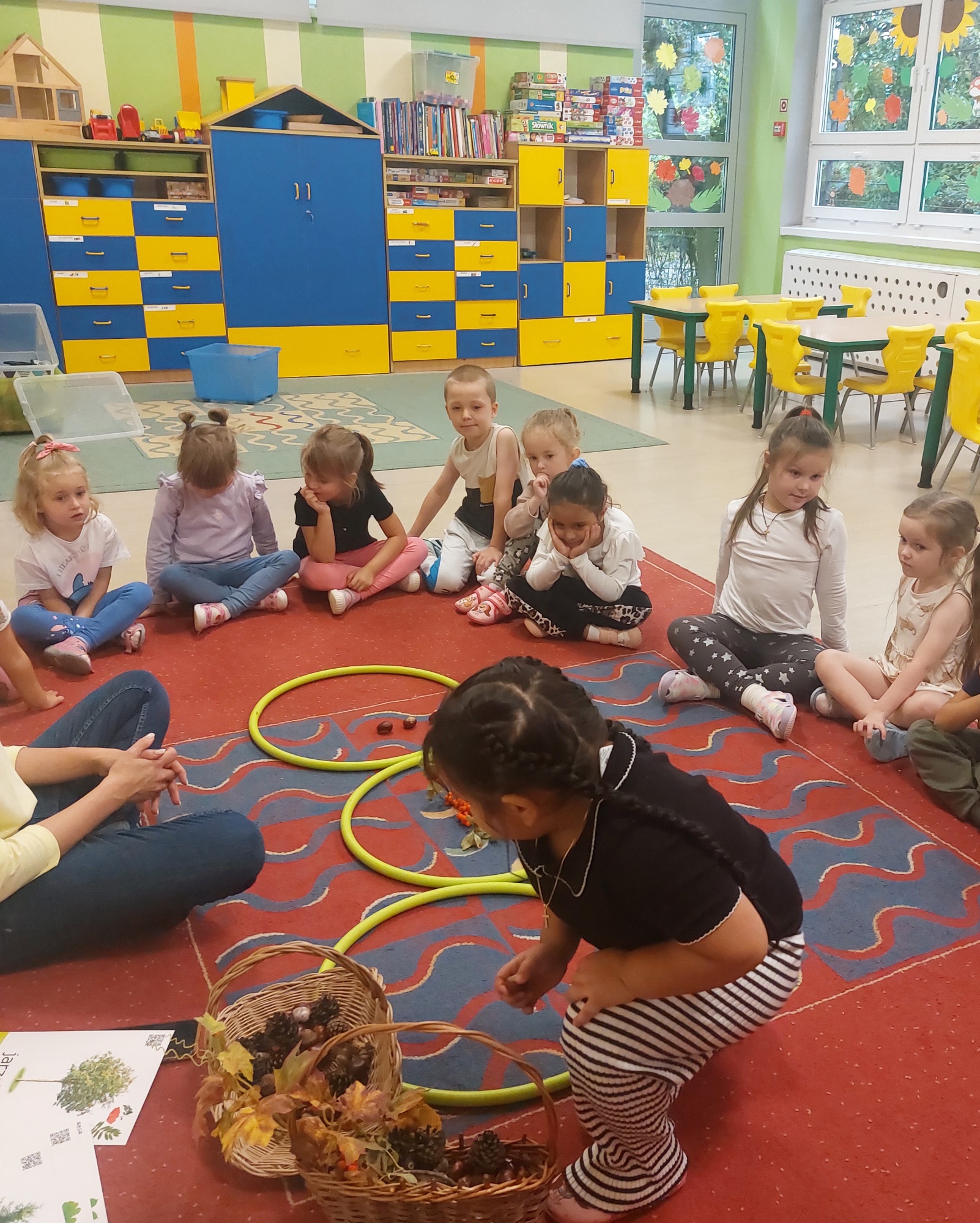 Rozmawialiśmy o zmianach, które można zaobserwować o tej porze roku w przyrodzie. Przedszkolaki z dużą ciekawością słuchały o atrybutach i cechach nowej pory roku, a potem chętnie dzieliły się spostrzeżeniami. Podczas zajęć dzieci miały również możliwość poznania darów jesieni.